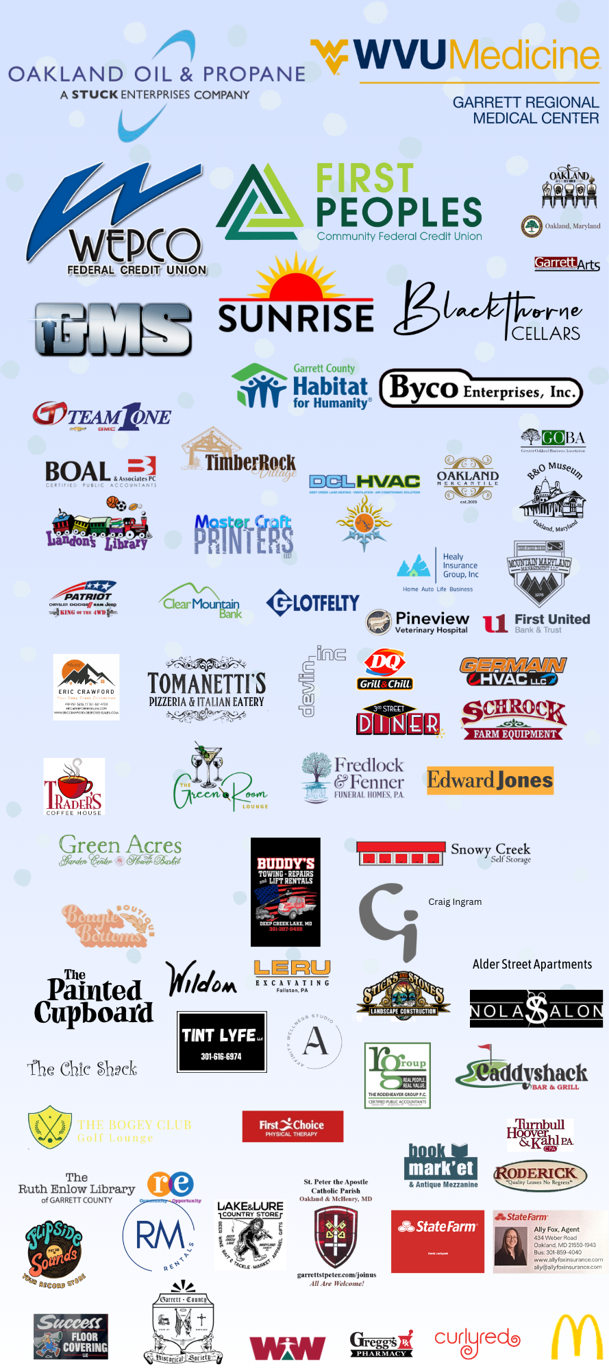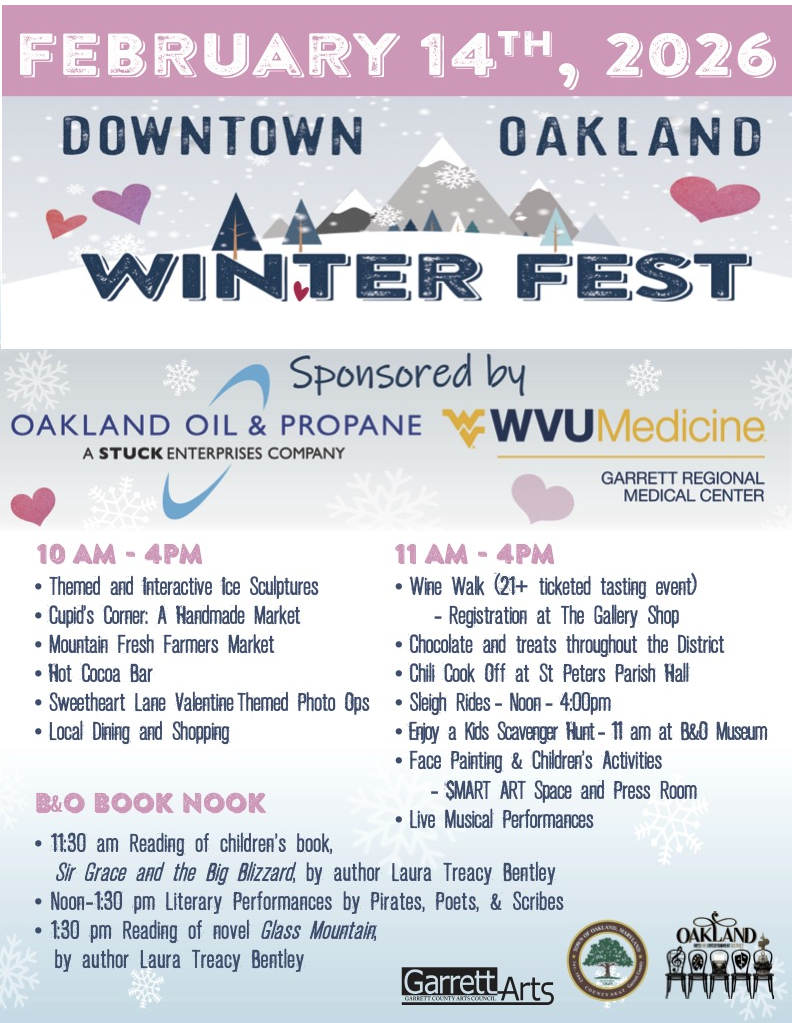 Winter Fest '26 Saturday, February 14, 2026 11:00 AM 4:00 PM 11:00 16:00 Oakland A&E District 108 South Second Street Oakland, MD 21550 USA (map) Google Calendar ICS Click HERE for Wine Walk Tickets! SPONSORS: Click here We are thankful for all of our sponsors and community partners!